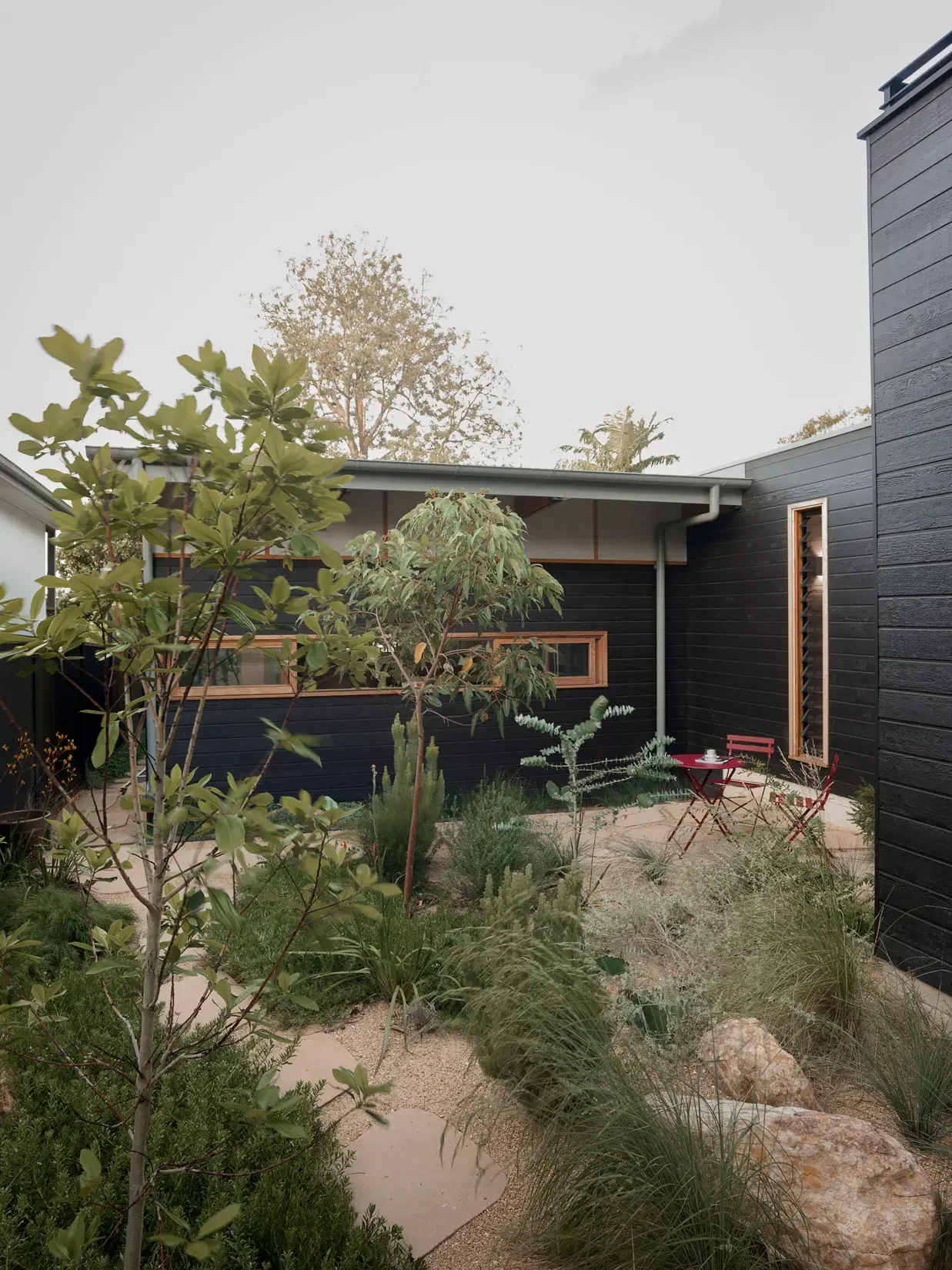 The gardens were designed to be predominantly native, each area with its own slightly unique character. Toby at Exterior Architecture was given a detailed brief for the landscape design that captured both the clients and the architects wish list and the result is striking in its ingenuity. The front yard is given over in it’s entirety to plants with no lawn requiring regular upkeep, rather the garden is left to be a little wild with a winding path to the front door, bird attracting plant species and several trees that over time will grow to provide a large canopy cover.